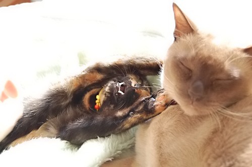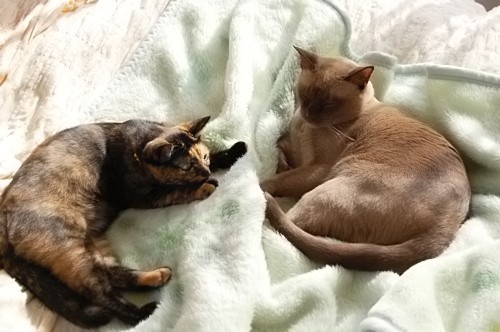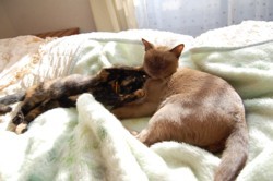 ベッドでとろ~んとしていた モコ さんの毛布へ、ネムネムの 王子様ネコ がやってきました。
