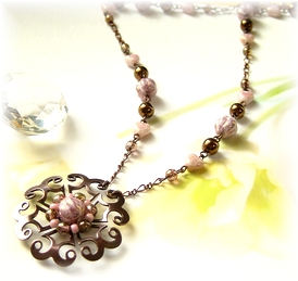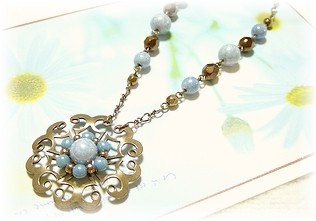 「Beads Mania」さんより購入のすかしパーツを使ったネックレスです。2つ買ったので、レシピ通りのものも作りましたが、こちらは手持ちのビーズを合わせて。着けた時のイメージはこちら↓パーツのこの形を見せたいので、(思いつかないのもあるけれど)トップのモチーフは同じです(^^;