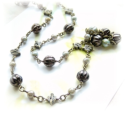 チェコビーズとメタルパーツを使ったネックレスです。黒に近いブロンズと、オペークグリーンの組み合わせなので、かなり渋めの色になりました(^^;