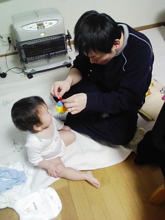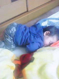 今日も、ラブラブな、おとうちゃんとゆっき~まん。。。 朝から、ばたばただったんで、お休みのおとうちゃんに着替えを頼んで。。。 ラブラブです。おかあちゃんの入る隙間は少しもありません。。な~~んてね^^ で、おかあちゃんは、半日仕事してきて、ゆっき~まんもお昼まで保育園に。。お昼過ぎに、おとうちゃんにゆっき~まんを迎えに行ってもらって、その足で、おかあちゃんも迎えに来てもらいました^^ありがとうございます。。m(_ _)mで、ゆっき~まんを、おとうちゃんに頼んで、グランメッセに鶴屋のセール品を見に行ってきました~。が、セールだけど、鶴屋の品は高い。。。。結局、ゆっき~まんの薄手の長袖シャツ1枚とクレープ(おとうちゃんにお土産)買って帰りました~。お目当てのカレーパンは、流石に売り切れでした。。。明日行って、買えるかな~~??ゆっき~まんも連れてるから、どうかな~~~ お家に帰ってみると、おとうちゃんは、毛布に包まれお昼寝中。。。ゆっき~まんが居ない~~!!!!で、見つけると、寝室で、力尽きてお布団の上で行き倒れてました。。おとうちゃん。。。自分ばっかり、毛布に包まって~~朝は、感謝でしたけど、放置はいけません。。。。私が帰ってきたら、早速大泣き・・・。夕方のミルクも準備してたのに、飲ませて無いし。。。ミルク飲ませたら、ふか~~い眠りに入ってしまって、お風呂の時間になっても、のような状態でした。。 1人で、相当暴れたんでしょう。。。お疲れ様~ゆっき~まん。。m(_ _)m明日は、おかあちゃんとラブラブな日曜日だよ~~
