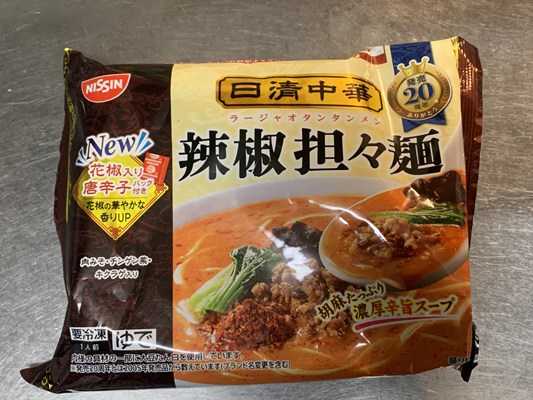 商品研究 日清の冷凍食品「麻辣担々麺」を試食日清の冷凍食品「麻辣担々麺」を試食します。500wで6分~6分半と少し長めですね。できあがりはなかなかうまかったです。昔食品部長にフードコートでこのようなものを使って欲しいと言われましたが、加熱時間が短ければいけますね。