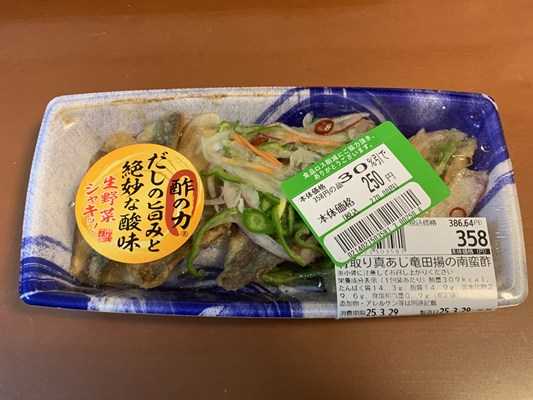 商品研究 「ヤオコー」の「骨取り真あじの竜田揚の南蛮酢」本体価格358円を30%引きにて購入して試食「ヤオコー」の「骨取り真あじの竜田揚の南蛮酢」本体価格358円を30%引きにて購入して試食します。ロピアにも豆鰺の南蛮酢がありますが、こしらは常温でジャストサイズですね。ロピアは冷蔵だったので多分、ブラストチラーで冷やしていた気がします。