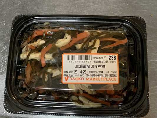 商品研究 「ヤオコー」の「北海道産切昆布煮」本体価格238円を試食「ヤオコー」の「北海道産切昆布煮」本体価格238円を試食します。油揚と人参と昆布。おかずにはちょうど良い味つけですね。