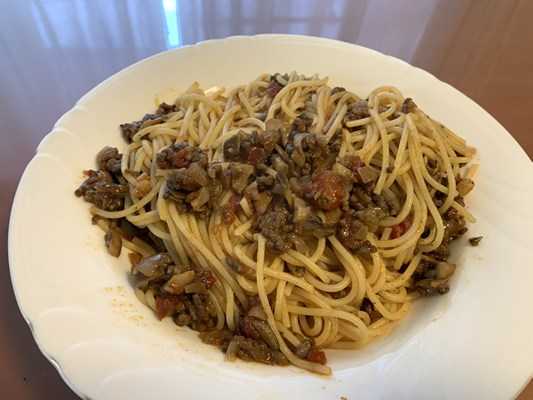 料理研究 挽き肉とマッシュルームのスパゲッティを試作挽き肉とマッシュルームのスパゲッティを試作しました。