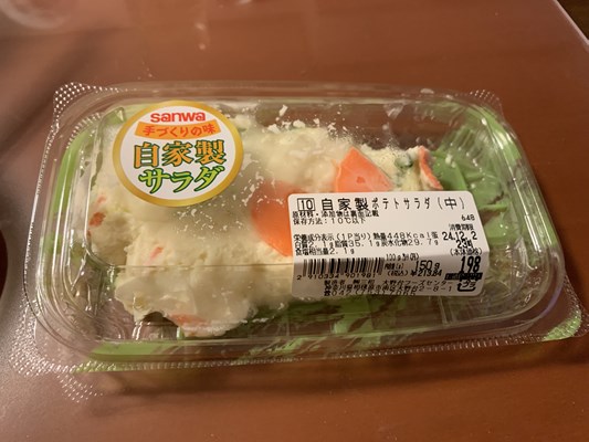 商品研究 「スーパー三和」の「自家製ポテトサラダ」本体価格198円「スーパー三和」の「自家製ポテトサラダ」本体価格198円を試食します。”自家製”ですが、酸っぱい、よくあるポテサラです。昔、対面販売の肉屋で売っていたあのなつかしい味ですね。