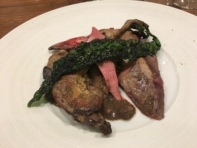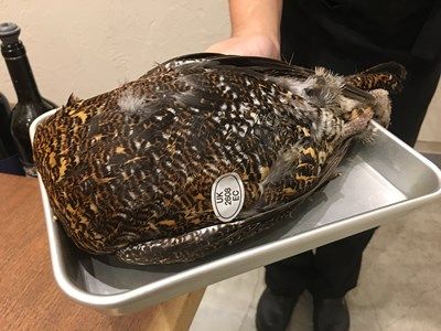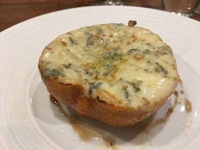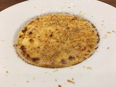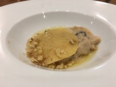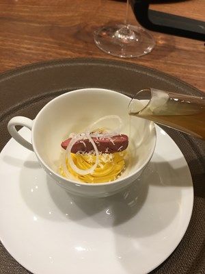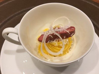 上は、白鳥レバーのコンフィ、ブロードは神奈川の地鶏のコンソメ、パルメザンチーズ、黒胡椒、白玉葱のアクセント。