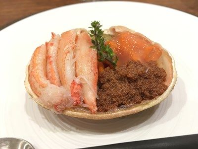 蟹身は白バルサミコ酢とオリーブオイルで和えて、カニ酢風。