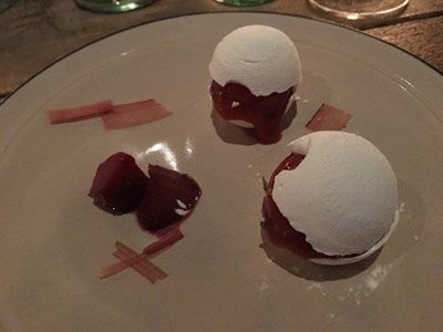 玉子に見立てた山椒の香りのアクセントのメレンゲにルバーブとパプリカの酸味のアイス