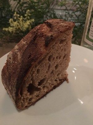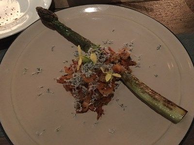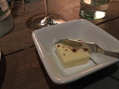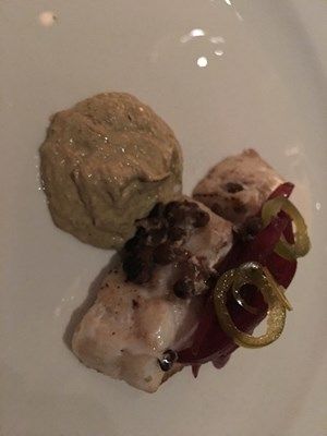 発酵させたレンズ豆を貼り付けて焼いた鱸、蕗の薹マヨネーズ、紫玉ねぎと青唐辛子のピクルス
