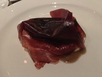 鴨のロースト 肝のソース、上にはラズベリーのシート
