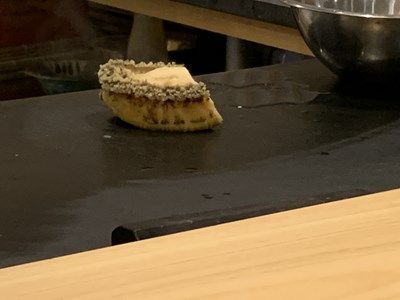 塩水雲丹をザル揚げしてあって、甘さもあり、おいしい。