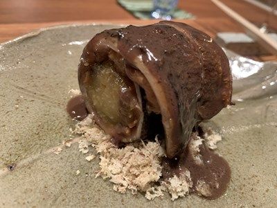 茄子を巻いた秋刀魚のわたソース、チョコレートが入っている