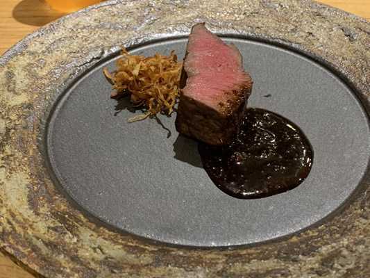 ソースは熊本の赤酒、お肉の出汁を煮詰め、阿蘇の名産、高菜の種のマスタードを加えています。