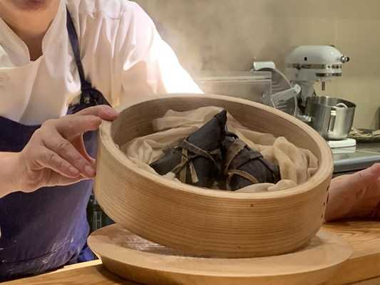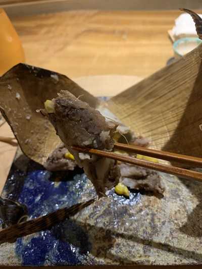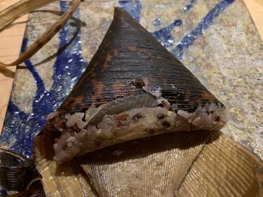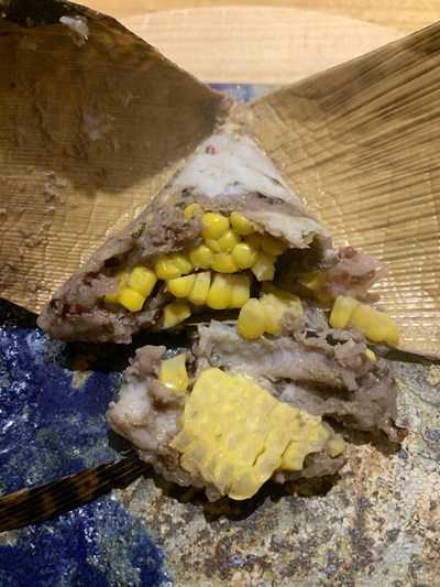 肝はペーストに。とうもろこし、赤米黒米もち麦、鮎身、肝、をまとめて竹皮で包み蒸しあげています。自家製鮎魚醤をお好みでかけるとうまい。