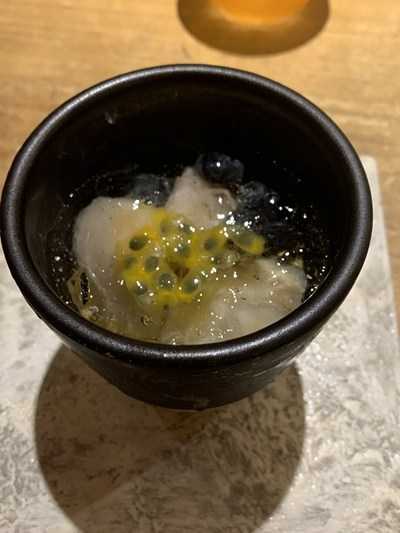 西村果樹園の桃、黒糖密、地元のパッションフルーツ、本田シェフが育てたブルーベリーを白ワインのジュレで。