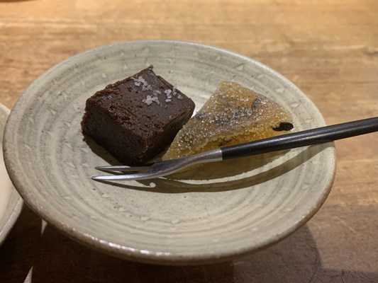 天草の塩をのせたチョコレートのテリーヌ、パッションフルーツの琥珀糖