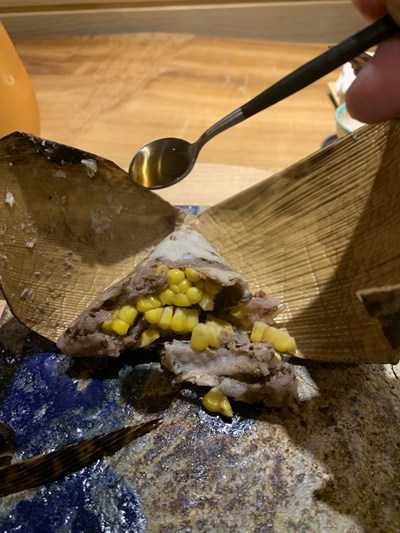 鮎の鬼の手こぶし、玉蜀黍と鮎の魚醤