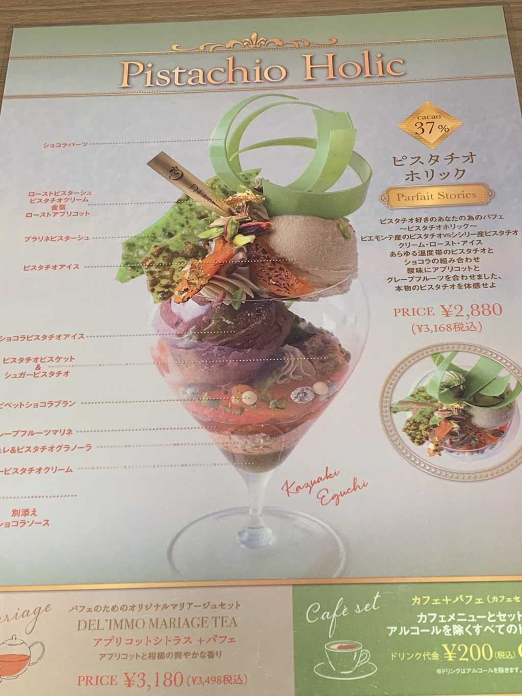 さて、今日は「ルーベンス・スープレックス」税込1,700円とこいけさんが発信していたモンブランパフェは月が変りなくなっていて(さすが)、“ピスタチオ好きのあなたのためのパフェ”「Pistachio Horic」税込3,168円とアッサムゴールド税込792円を注文します。ドリンクと何かを同時に注文するとセット割引があるらしく会計時に200円引きになっていました。