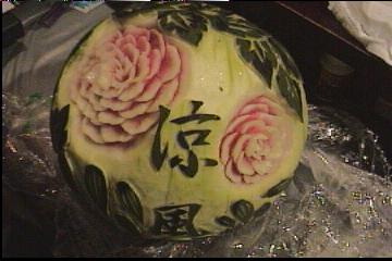 暑中お見舞い!!今回の反省点 字が小さくてインパクトに欠けること!お花がかわいくなかったこと・・・・・・うまくいった点は、画像では見えにくいですが笹の葉が涼しそうだったこと・・・・あと2個のすいかが控えておりま~~す。なにを彫るか・・・・思案中!!