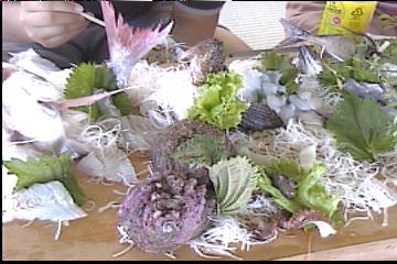 鯛やサザエの舞い踊り・・・・ピチピチ、ブリうま!梅雨空けの、絶好の海日和でありました。恒例の漁師見習!っていうか・・・・・漁船に乗り込み漁師のおじさんの網漁を見学し、無人島でピチピチお魚ずくしのお食事をする。で、捕ったお魚は全部お持ち帰り!というなんとも旨い我が家のイチオシの夏の行事。あれこれ、22年の付き合いの漁師のおっちゃん・・・・・うれしいね、『おう、久しぶり!』なんちゃって、年に一度の里帰り感覚で迎えてくれる。あら、まぁ~、夏休みのお手伝い~~!!だった子供さんたちも、いまや立派な漁師のアンちゃんだ!本日は、よろしく~~っ!!山里から1時間半・・・・・やっと海につきます。【広島県・上蒲刈・宮盛漁港】【本日の船】ビール満載で、いざ出港!!♪♪あみぃ~をひきぃ~あげる・・・・ 大漁だぁ~~~!!メバル・ハゲ・鯛・オコゼ・・・・・サメやお馬鹿なタコまで入っていましたぁ~~~~。コレ、すべてお持ち帰り!!船は無人島に着きます。桟敷の下の海!木陰の桟敷でお食事しますが、桟敷から飛び込みもOK!なんたって、プライベートビーチだもんねぇ~~~。海の男の手料理は豪快で旨い!海で遊ぶ私達を横目にオッちゃん達は、船上で料理し、次々と桟敷まで運んでくれます・・・・感激!哀れ、煮魚・・・・・プリプリ!えびのかきあげ。他に名物・タコ天!!宴たけなわ・・・・・酔いも回り・・・・絶品の鯛めしの画像は収録不能!!残念!ただいまぁ~~~、おみやげ~~!! 網にかかったお馬鹿なタコ、哀れ煮え湯の中に・・・・・あ~~あ、おいしい一日だった・・・・・・オッちゃん、ありがとう!!来年もまたよろしくねぇ~~~~!!