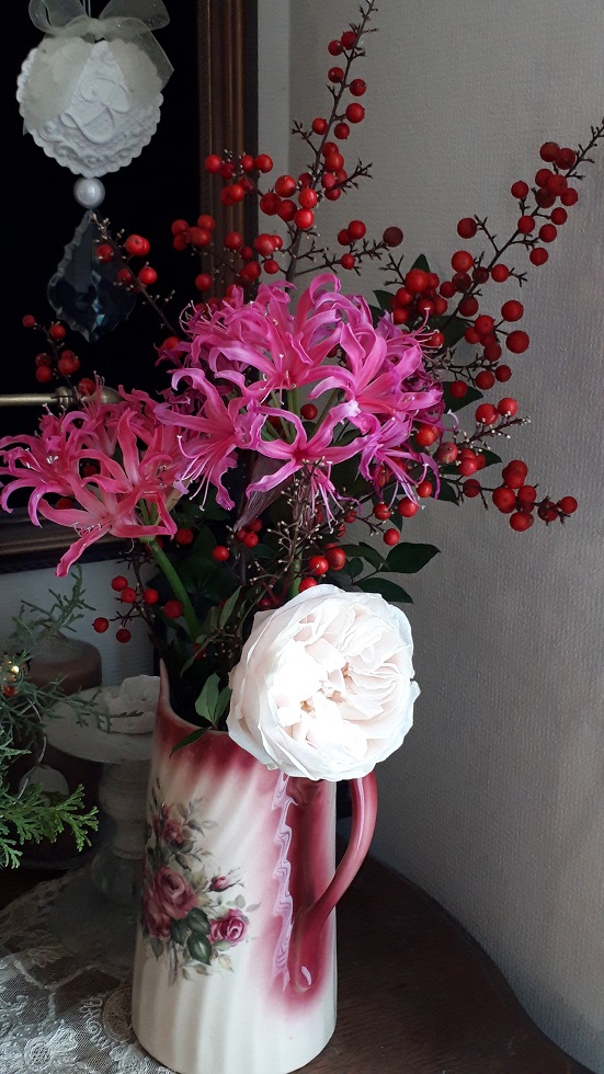 遅くまで暑かったせいか?お庭の葉がようやく紅葉し始めました紫陽花ブルーベリーホスタブラックベリーベルガモット我が家でプチ紅葉を楽しんでいますネリネ(ダイヤモンドリリー)が満開~ひとつのお花は3週間は楽しめる花持ちバツグンです!青空と南天の実 お正月の生け花に使います