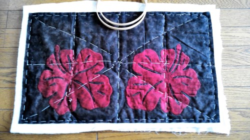 今日は暑い!!ポポ(犬)の為にクーラーかけて室温26度ハイビスカスのモチーフをやっと完成しましたキルト綿をはさんでしつけしてなぜか裏の布が余ってる。。。奥たてまつりが難しかった~カーブも綺麗に出来なかった~色的に秋っぽいね茶色の土台にえんじ色のハイビスカスモチーフどちらもむら染めバッグになる予定大きさはA4サイズが余裕ではいるくらいマチ付にするか迷ってるところ。。。