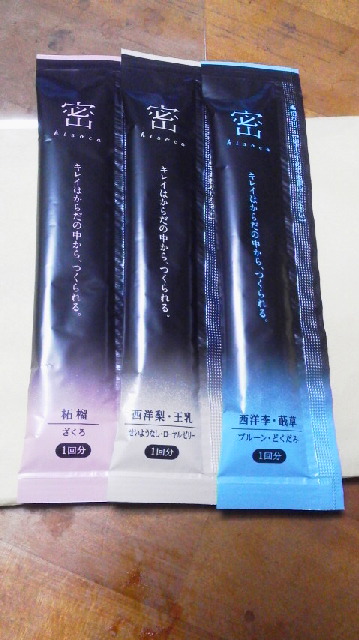 密(ひそか)という大正製薬が作っている美容サポート飲料があります。東洋ハーブと西洋ハーブを組み合わせたドリンクで割とすっきりした味で飲みやすいのが特徴です。美的という美容雑誌でこの密のサンプルの応募ができて、それが当選したとの封筒がきました。最初小学館と書かれた茶封筒がきたので何だかわからず、開封してみてああ、これか!って感じでした。こんな感じのスティックです。サンプルで届いたのは5種類あるうちの3つ。柘榴、西洋梨・王乳、西洋李・蕺草(どくだみ)でした。試しに西洋李・どくだみを飲んでみました。普通のジュースみたいにさっぱりした味で飲みやすい。ほんのりハーブの香りがするかな?って感じです。これは食物繊維が入っていて毎日快調を目指す人のドリンク。その他にも巡りを整える生姜、むくみ予防の蔓苔桃があります。瓶タイプとスティックがあります。スティックだとどこでも持ち運びできるので便利ですね。各メディアで話題の美容サポート飲料『密(ひそか)』 大正製薬『密(ひそか)』-hisoca-大正製薬 ...価格:5,400円(税込、送料込)楽天にも取り扱いがあるみたいです。それなりにいい値段はしますけど、インナービューティーっていま注目されてるので人気でるかも?それではまた(*^^)v