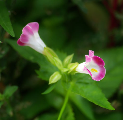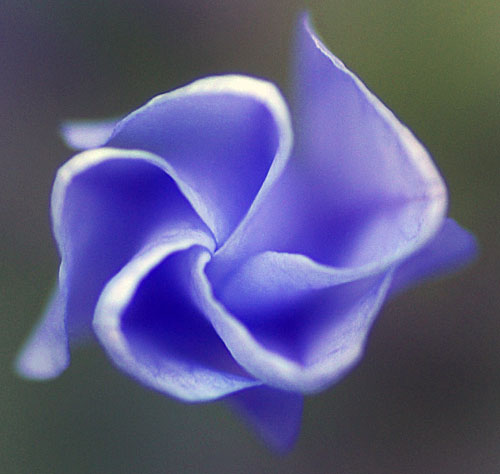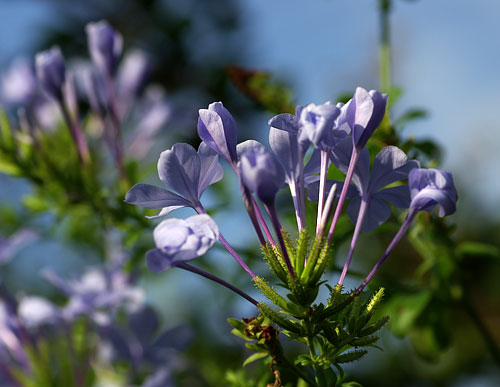昨日載せたけど、コリウスの花の形がもっとよく見えるように、撮り直してきましたよ。見えている花穂は、すべて、向こう側の黒っぽい葉っぱの方のものです。手前の派手な葉っぱのものからは、一本も、花穂が伸びていませんでした。こちらもそうです。大きい方のコリウスには、花穂がないでしょ?で、右隣の葉っぱの縁にフリルがあるほうは、花穂が、いっぱい。 では、接写ですよ。ツートンカラーの、爽やかなお花。でも、なんだか、面白い形。犬の耳みたいなところは、白に青紫の縁取り。鼻先のようなところは、綺麗な青と青紫のグラデーション。おしべが見えたら、かたつむりみたい。