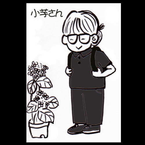 発表が遅れてすみませんでした。 では、答え合わせをお願いします。 元の画像は、これでしたよね。 これの、どこが変わっていたかというと、これです。A 車のライトが消えている。 係員の人が、一人増えている。B 人が、前に移動している。 植え込みが増えている。C お客さんの向きが逆になっている。 植え込みが消えている。D くいの高さが高くなっている。 黄色い花が増えている。E ひもが消えている。F 黒いホースが見えなくなっている。 黄色い花が消えている。以上、11個の間違いでした。ということで、1個しか間違いがないパーツは、Eでした。 では、今日は、少し易しい問題ですよ。まずは、元の画像です。これは、だいぶ前に想像で描いた「小芋さん」の絵。似ていると、お褒めの言葉をいただきました。 では、このイラストを、ちょちょいのちょい。少し変えてみましたよ。全部で8個。さあ、何秒でわかるでしょうか・・・・では、よーい、どん!!