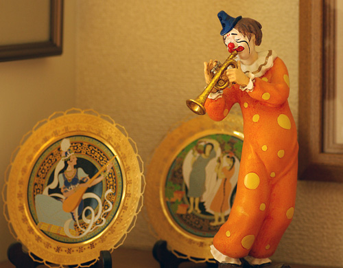 では、次に、小物をいろいろと紹介します。まず、玄関から。このピエロさん、トランペット吹いてるけど、何考えているのかなぁ。後ろの飾り皿は、どこかのお土産。 次に、仏間ね。お花の絵の下に置かれています。 次は、エレクトーンの上ね。中国のものが多いのかなぁ。 次は、居間です。ここにも、動物やピエロなど・・・ では、ベッドルーム。なんか、不思議な雰囲気ですね。 最後に、こんなものはいかがでしょうか。これは、敦煌に行った時のお土産かなぁ。 では、今日は、このくらいでおしまい。珍しく、屋内の写真でした。