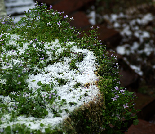 もう終ったと思っていた、白玉椿の上に、結構大きな雪が、降り積もっています。これは、早朝、雪が降っていなかった時。 ピンクのデージーも、寒そうです。 キンカンも・・・ 椿のつぼみも・・・元気者の、バイオレット・クレスも・・・・ みーんな、寒そうだけど、がんばっています。 でも、どうしよう。うちの周りの道路は、雪で埋まっています。 降りることはできても、帰りが、心配です。道が凍って、登れないかも・・・ 「明日にしようよ」って、電話してみようかなぁ。