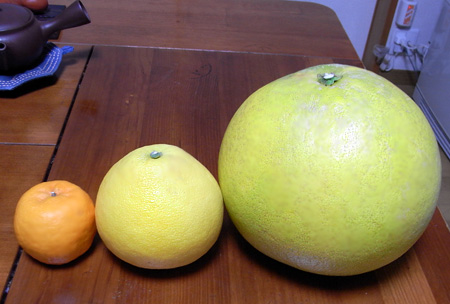 今日は、うちの次男の17才の誕生日。シマホッケの干物があったけど、ちょっとそれでは寂しい気がしたので、今日は賑やかに、スキヤキにしました。おまけに、お肉は、「黒毛和牛」をどーんと、1300gほど。 美味しくて、お腹一杯になりましたよ。 さて、私が食事の準備を終えた時に、旦那がお土産を買って帰ってきました。次男の誕生日祝いというわけではなさそうです。 それは、これ。 一番左のポンカンと比べてください。まん中は、例のパール柑。そして、右はじが、旦那のお土産、晩白柚です。 きっと、最近私が、パール柑の皮のお菓子に夢中だったから、買ってきてくれたのだと思います。この晩白柚を2個、ビニール袋に入れて、得意そうに持って帰ってきてくれましたよ。 しばらく置いておいてから、今度の土日くらいに、またチャレンジしてみましょう。 今度は、でっかい砂糖漬けができそう!! そうそう、昨日のオランジェット(オランジェ?)は、今日、職場に持っていって、同僚たちと一緒に食べました。 「チョコは作っとらんけど、中に入っとうのは、私が作ったとよ。ね、食べてみて。清潔ーに作っとうけん、安心して食べてね。」 みんなで食べたら、あっという間になくなりました。また、作ろうっと!!