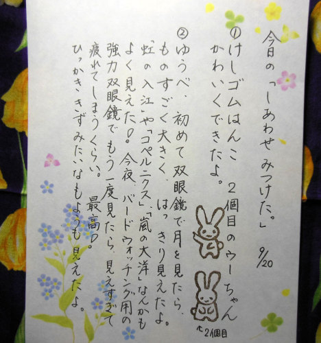 普段、舞台やコンサートの時に使っている、15倍の双眼鏡(オペラグラス)で見てみたら、月のクレーターが、よく見えて、うれしかったです。今日、バードウォッチング用の、倍率がとても高い双眼鏡も持っていたことを思い出して、ちょっと使ってみたら、まあ、すごい。天体望遠鏡で見た時のように、非常に細かい線まで、よく見えます。 ただし、三脚なしで見るのは、なんだか酔いそうでした。 では、おまけ。昨日のクコも、この花も、植物園で撮ったものですよ。