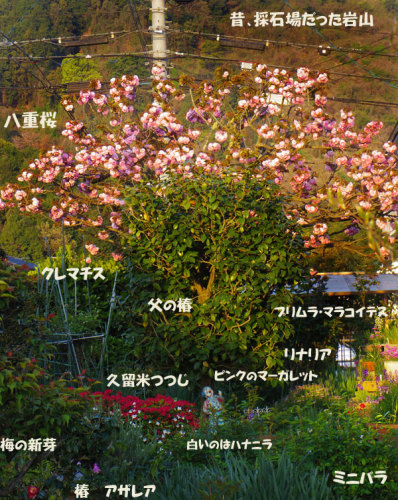 いろんな花が、次々に咲いていますが、このツツジは、一気に咲きました。 上の二枚を比べてください。ね、あっと言う間に、満開です。 ついでに言うと、この木は枝振りが変わっているの。 まるで、わんこが飼い主に向かって、お手とかしているみたい。花が多すぎて、枝が見えませんね。 このように、場所によって、色も模様も違うので、とても美しいし、楽しいつつじです。 この木のまわりには、ピンクや紫の「都忘れ」がいっぱい。 姫空木も咲き始めました。あ、アマドコロも・・・・ 八重桜と、胡蝶侘助の根本では、すずらんも咲き始めています。 あ、忘れちゃいけない、「オオツルボ」シラー・ベルビアナです。 この独特な花の形。おしべもめしべも花びらも、すべて肉厚で、同じような色で、迫力たっぷりです。 シラーといえば、これも。白やピンクも、咲き始めましたよ。 そのピンクの花よりも先に、スパラキシスがぐぐっと伸びました。 数年前までは、このスパラキシスが、庭の1/4くらいの面積に生えてきて、ものすごい状態になっていたのですが、あの、母の手にかかって、ずいぶんおとなしくなりました。 こんな細い通路を通りながら、庭の真ん中の方へ・・・ するとね、こんなクレマチスが3輪咲いていました。 うれしいですね。 久留米つつじは、少し葉っぱが育ってきて、見えるようになりました。 ブルーベリーの花も、数が多い、多い。今年の収穫量は、増えそうです。 では、まだまだあるのですけど、まずはこれくらい。 さて、金曜日の夜は、職場の飲み会でした。ホテル イルパラッツォ という変わった建物の地下のパーティ会場でしたよ。 面白かったのが、トイレ。入口のドアを開けると、便器の蓋が自動的にぱかっと開いて、「おおっ!!」 事をすませると、自動的に水が流れ、手を洗おうと、蛇口の下に手をやったけど、水が出ません。 あれっ??? よく見ると、「時計まわりに回してください。」とある。 蛇口の先っぽについている小さなつまみをくるっと回したら、お水が出てきましたよ。 いろんなところが自動式なのに、どこでもやってる自動での手洗いは「なし」不思議なトイレでした。