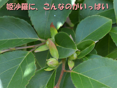 この間のせた、この写真。 これが、つぼみなのかどうか、よくわからなかったのは、その位置。 だって、お花は、たしか、下向きに咲くと思っていましたから・・・・ (これは、昨年のようす) それで、つぼみなのかどうか、切って調べてみたわけです。 さて、今日、もう一度よく観察してみました。 つぼみは、確かに、葉っぱの上にあります。 どのつぼみも、みーんな葉っぱの上。 だけど、咲いている花を見ると、 このように、葉っぱの下・・・・ なら、咲きかけの花はどうなのかな・・・と、探してみましたよ。 すると、ありました。 このくらいの、咲きかけの花は、葉っぱの間から、下の方へ、もぐりこんでいる途中でした。 これは、うまくもぐれなかったのか、葉っぱの上。 これは、葉さきを持ち上げて撮ったのだけど、 たいていの花は、もぐりこみに成功して、下向きに咲きます。 よく見ると、もう実になっているものと、昨年の実とがいっしょに写っていました。 花は、下向きの方が、雨で蜜や花粉が流れなくていいのかな? それとも、下向きの方が、虫たちが安心して活動し、受粉のお手伝いをしてもらいやすいのかなぁ・・・・ というわけで、姫沙羅は、つぼみは開いていく途中で、どんどん葉っぱの下にもぐりこんでいく・・・ということが、観察でわかったのでした。 さて、あっという間に、月日は流れていきますね。 毎日更新しよう!!とか決めているわけではないけれど、今回は、ちょっと間があいてしまいました。 編んだストールに、ビーズを縫い付けたり、またまた違う色でストールを編んだりしていたからか、映画やドラマに熱中していたからか、さしたる理由は思いつかないのだけど、更新しそこねていましたよ。 毎日が週末気分・・・ これが、これから先何年くらい続くのかなぁ。 (働かないのに、ちゃんと生活していけそうなのは、とってもありがたいことです。) そうそう、いよいよお伊勢参りが近づいてきました。 二泊三日で、高野山や、熊野なんかも周ります。 世界遺産になっている場所をたくさん見ることができそうなので、とても楽しみ。