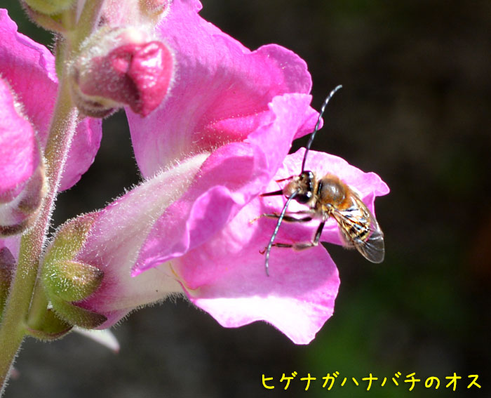 今日は、快調に進み、さきほど日付が変わった頃に、無事完成しました。B5のノートがちょうど入るくらいの大きさに出来上がりました。裏が無地なのは寂しい気がしたので、菱刺しを四種類。中袋は、ポケットもファスナーも縫い付けてから、最後に取り付けました。この赤い布で作ったポケットは、底まで届いています。だから、バッグの中の仕切りのようなもの。斜めに掛けるというので、その長さピッタリ(そのまま手を突っ込んで、バッグの底が触れる長さ)に合わせて作りましたよ。色が微妙に違うけれど、100均に売っていたバッグの持ち手用のひもを使いました。すぐにでも次男坊に見せたいのですが、もう寝ているようなので、明日の朝に渡すことにします。楽しみ~♪ (o˘◡˘o)♡ではおまけ。庭のお花を撮っていたら、可愛い虫が・・・次々に移動して蜜を吸っているようです。丸くてフワフワで、羽が虹色で、素敵です。ホバリングしながら蜜を吸っている様子は、まるでハチドリみたい。他に、似たような雰囲気の虫では、ホシホウジャクとかオオスカシバとかがいますけれど、この虫は、ハチくらいの大きさ。ころんとして本当に可愛い。ビロードのように毛が密集して生えていて、上から釣られているみたいに止まって蜜を吸うから「ビロードツリアブ」この虫は春にだけ見られるそうです。ということは、他の季節には、幼虫か卵の状態でずっと過ごしているということですね。そうそう、ヒメハナバチの幼虫に寄生して育つそうですよ。親は、ヒメハナバチの巣の入り口に卵を産み落とします。その卵から幼虫がかえると、すぐにその巣の中に入り込んで行き、巣の中の食糧を食べたり、巣の主のハチの幼虫の体の汁を吸いつくす・・・ということらしい。youtubeで、ビロードツリアブの産卵の様子が紹介されていました。始まって17秒くらいのところで、白い物がひょいと出てきます。これが卵なのかなぁ。うちの庭にいたのはオスだから、産卵はしませんね。今度メスがいたら、よく見てみよう。あ、でもヒメハナバチの巣があるかどうか、それがわからない。地面に穴はいっぱいあいているけれど、セミの幼虫が出てきた穴だろうと思っていました。今度よく見てみることにします。