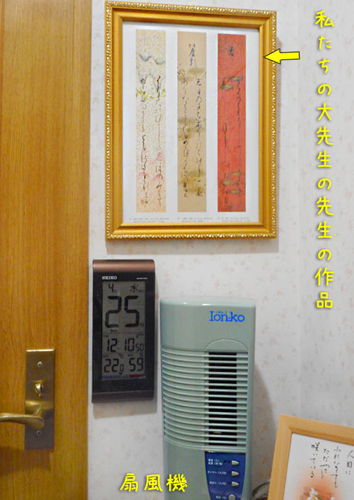今日は、かな書道教室の皆と一緒に、朝9時3分の新幹線で博多駅に行き、書道会の研修会に参加してきました。各自、自分が今書いている作品を持って行って、大先生たちに指導していただけるとのことでしたので、私は古典の臨書を持っていきました。これは、女性の先生が、実際に書きながら説明をしてくださっているところ。今日のメインは筆の使い方でした。これが、説明しながら書かれた物の一部分。私が一番びっくりしたのは、一行書いたあとすぐに、次の行を書かれていたこと。書いた文字の上に肘から下の腕をすぐにぴたっと載せて書いているのに、紙や腕が全く汚れていないのです。私は紙を汚さないように、完全に乾くまでは絶対に触らないようにするため、いつも手作り腕枕を使っているというのに、なんで??? 乾きが早い墨なのか、紙が特殊なのか、じっくり見たけれど、よくわかりませんでした。日本の文字を縦書きに書き進んでいくとき、右利きだと、どうしても書いた直後のところを右手で汚してしまう。それが悩みだったのに、本当に不思議でした。それと、この女性の先生は「一回の展覧会の作品を書くのに、この筆10本は使います。」とおっしゃっていました。見せていただいたら、1500円の筆。私たちがいつも使っているのは1800円の筆なのですけれど、字の上手下手は、筆の値段では決まらないのかなぁ・・・と、横の人とひそひそ。私の書いた物は、先に男性の先生に見ていただきました。2年前にも指導していただいたことのある先生なのですけれど、「古筆を始めてまだ1年くらいで、これくらい書けたら、たいしたもんや。」と言っていただいたので、うれしかったです。午後になってから、女性の先生にも見ていただいたのですけれど、高野切よりも寸松庵色紙の方が直されたところが少なかったです。そして、「あなたの線は、伸び伸びしていますよ。」と、また言われたのでそれが私の個性なのかなぁ・・と思いました。作品の指導の後、みんなでDVDを見ました。私たちがあったことのない、大先生のそのまた先生の貴重な映像で、実際の筆の使い方を見せていただきました。この写真は、今の大先生(私たちの先生の先生)の書かれているところ。まだ50歳くらいの頃の様子と、30年後の様子を比べたりして、解説も面白かったです。今日も、親子連れとかカップルの人たちが、写真を撮っていましたよ。