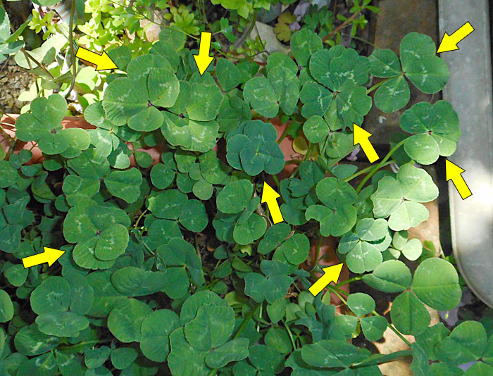 私は学生の頃から、四つ葉探しが大好きで、得意でした。歩きながらでも見つけることができたのですよ。たくさんある中に、ぱっと目に飛び込んでくる四つ葉。中心の顔が違うんですね。さて、昨年私が種まきをして、あとは母が水やりをして育ててくれたクローバーが、無事に冬越ししました。今日そのプランターを見たら、四つ葉がかたまっていたので、パチリ。よそで見つけた四つ葉は、さっと摘んでノートなどに挟んで押し葉にしますが、自分の家にある四つ葉はそのままにしておきます。摘むのがもったいない。で、これが、今年の誕生日記念品。自分で買いました。小さな四つ葉のネックレスです。ついていたチェーンがあまりにも細くて、切れたらもったいないので、手持ちのカットボールチェーンにつけかえて付けています。で、黄緑色がペリドット、濃い緑がグリーンクオーツ。つまり緑の水晶ですね。ひょっとしたら、アメジストを熱処理して緑色にしたものかもしれませんけれど、きれいなのでいいです。真ん中に、0.006カラットという、実に小さなダイヤが入っているのですが、あまりにも小さくて見えませんね。この紙、5mm方眼ですから、この四つ葉は、横幅8mmくらいかも。でも、メッキではなく、ちゃんと18金です。昨年かな? 娘に大量のネックレスや指輪をあげてしまったので、手元に残っているのは少しだけ。そのうち、今残っているものも、全部娘にあげちゃいますが、もうしばらくは、サークルなんかにつけていきましょう。63歳の誕生日記念の四つ葉でした。では、今日の庭のようすから・・・まずは姫沙羅の木。今回は、根元も見えるように写しました。根元から幹が分かれているのが見えるでしょうか。このように形を作るのが流行なのだそうです。(むむ、どうやったのでしょうね。)で、家側は葉っぱが大きくて、南側の日当たりの良い幹の方が葉っぱがまだ小さいの。そのうち大きさがそろいますが、面白いです。一昨年は、このちょうど真ん中あたりにヒヨドリの巣があるのをみつけました。その後気をつけているのだけど、巣は見つかりません。ヒゴスミレの全盛期が終わり、今度はアリアケスミレの季節。葉っぱが長く、花が地面から直接生えています。門の横のツツジも、少しだけ咲いていました。庭のあちこちに、フリージアが・・・八重桜の花びらがいっぱい散っています。