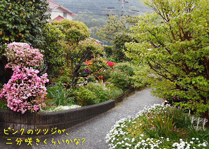 以前から、燃えるゴミに出す物は少な目だったのですが、四月になってから、ますます減ってきました。というのは、このお知らせが来たからです。今まで、燃えるゴミの袋に入れていた物は、野菜くずなどの生ごみと紙ごみでした。トレイやビニール袋などの包装ごみなどのプラゴミは、別に「再生ごみ」として袋詰めして出していたので、燃えるゴミは一番小さい袋で、週に二回で十分だったの。でも、四月になってから、子供会育成会からのプリントが来て、雑紙を紙袋に入れて廃品回収に出すことになりました。今までもそうだったのかもしれませんが、今回初めて、こんなに詳しいプリントが来てびっくり。真面目な()私、張り切って紙袋を準備して、雑紙をそれに入れるようにしたら、すでに紙袋二つがいっぱいになってしまいました。燃えるゴミの袋に入れる物は、野菜くずなどと、母の鼻紙、ものすごーく汚れた紙類くらいなので、一週間に一度でもよさそうです。今の生活で、いかにプラごみと紙ごみが多いのか、よくわかりました。これで生ごみをコンポストに入れたりしたら、いよいよゴミが出ないかも。だいぶ前、庭にコンポストを置いていた時期もあったけれど、けっこう管理が難しいので母がやめてしまいました。これは、その当時の写真です。では、今日の庭の様子です。まずは、駐車場から見た庭左手前のつつじのつぼみが、ずいぶん大きくなってきました。明日くらいから少しずつ咲くかもしれません。庭の真ん中あたりの真っ赤なツツジは、きれいに咲いています。真っ赤なツツジの横には、こんなツツジも。一重のツツジも咲いています。これは、昨日とはまた別の花。アッツ桜の数が増えてきましたよ。バラが咲き始めたので嬉しいな(^▽^)/あと、ウツギの仲間も、これからがシーズン。楽しみです。