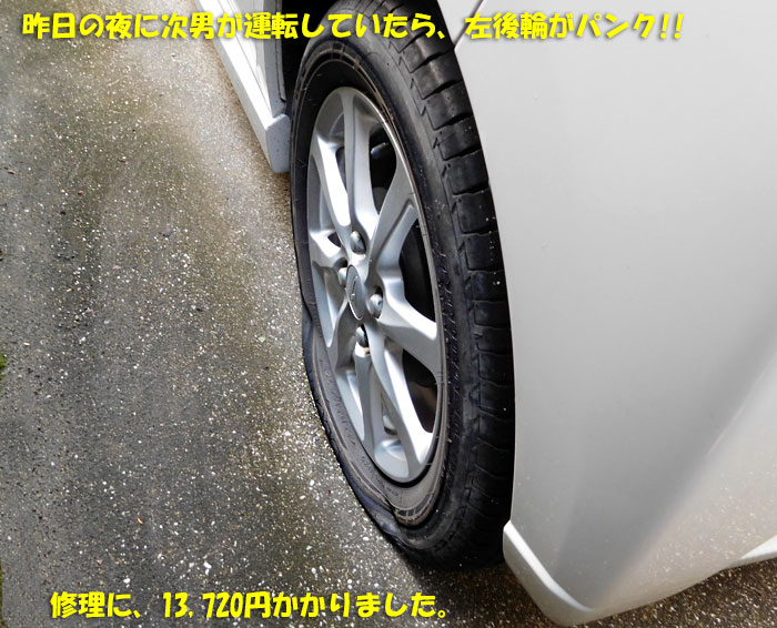 昨日、夜遅くに私の車で帰ってきた次男坊。「お母さん、途中からなんか変な音がするねーと思っとったっちゃけど、今見たら、タイヤがパンクしとった。後ろの左側。」というので、今朝明るくなってから見てみたら、あらまー、本当にパンクしています。何かに乗り上げた、と言うことはなく、普通の道を普通に通ってきただけのようです。きっと、台風で何かとがったものが飛ばされて、道に落ちていたのでしょうね。この車を買ったお店は、自動車修理工場でもありますので、朝、8時半ちょうどに電話をしました。わけを話して、何時頃に持っていけばよいかを尋ねたら、〇 午前中は手が足りないので、午後にしてほしいこと〇 運転して自分で持ってくるのは危ないから、ロードサービスを頼んだほうがいいことの二つを言われました。JAFは、旦那が入っているけれど、家族用のカードとか今はもらっていない、家族も含めた契約になっているのかよくわからない、と言うと、「自動車保険に、ロードサービスがついとーですよ。」と言われたので、さっそく調べてみました。すると、まあ、確かに!! 私の契約では、こういう時に車を修理工場まで運んでもらえることになっていました。さっそく電話をして、わけを話して、車を取りにきてもらうことにしましたよ。工場の方が午後、ということだったので、うちにロードサービスが来るのも、お昼。12時少し前ということになりました。11時50分頃に、担当の人が来られて、私の車を点検したら、釘が刺さっているのを見つけられました。根元まで刺さっているので、ちょっとくらいは空気が抜けないかもしれないと、このパンクしたタイヤに空気を入れて、坂の下にとめているトラックに積み込んで運んでいかれました。あとで工場の人から電話があり、新しいタイヤに替えた方がいいけれど、注文して取り寄せていいかどうか尋ねられたので、お願いしました。走行距離は1万を少しこえたくらいだけど、5年半乗っていますからね、替え時かもしれません。全部しあがったら、また連絡します・・・とのことで、あとは待つだけ。3時くらいかなぁ・・と待っていたけれど、なかなか時間がかかったようで(取り寄せだからね)、結局夕方の5時15分くらいに電話がかかりました。それからすぐに、徒歩で出発。車だったら、5分くらいで行ける距離です。近道の裏通りを通ったけれど、歩いたら15分かかりました。いい運動になったかも。車の中のそうじもきれいにしていただき、外側の洗車もしてもらっていたみたい。で、新品のタイヤに交換して、工賃も含めて、全部で1万3720円でした。これが高いのか安いのかわかりませんが、買ったお店で、純正の物をつけて頂いたので、なんか安心感があります。今回の台風17号の被害、といえるかも。ではおまけ。塗り絵ね。こういう図柄はとても簡単で楽しい。おまけに、どこが塗り残しなのか、すぐに見えます。でも、こういう絵だと難しい。まだ三か所塗り残しがあるのですが、見えますか?一つは、ど真ん中あたり。あとの二つは、左上でした。