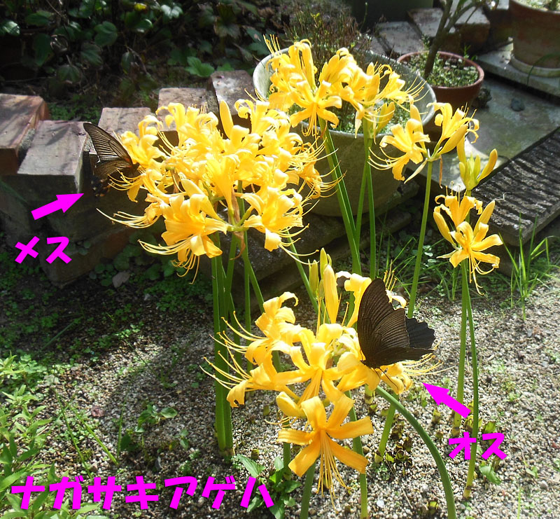 これは、鍾馗水仙の蜜を吸って、私を全く気にしていないナガサキアゲハたち。オスとメスです。