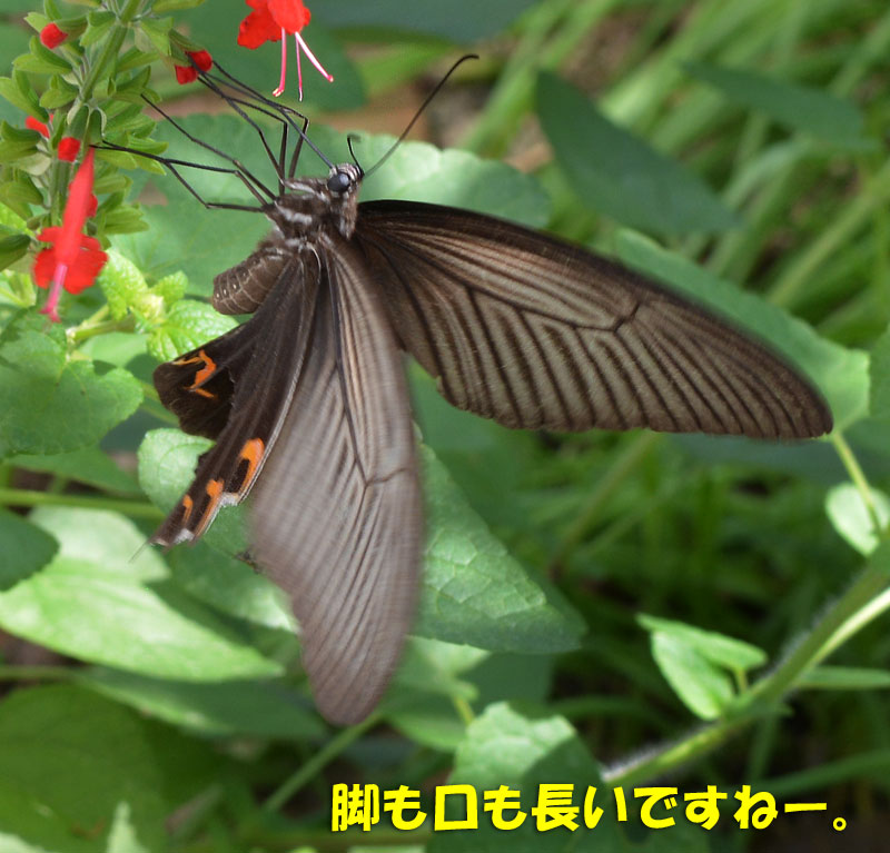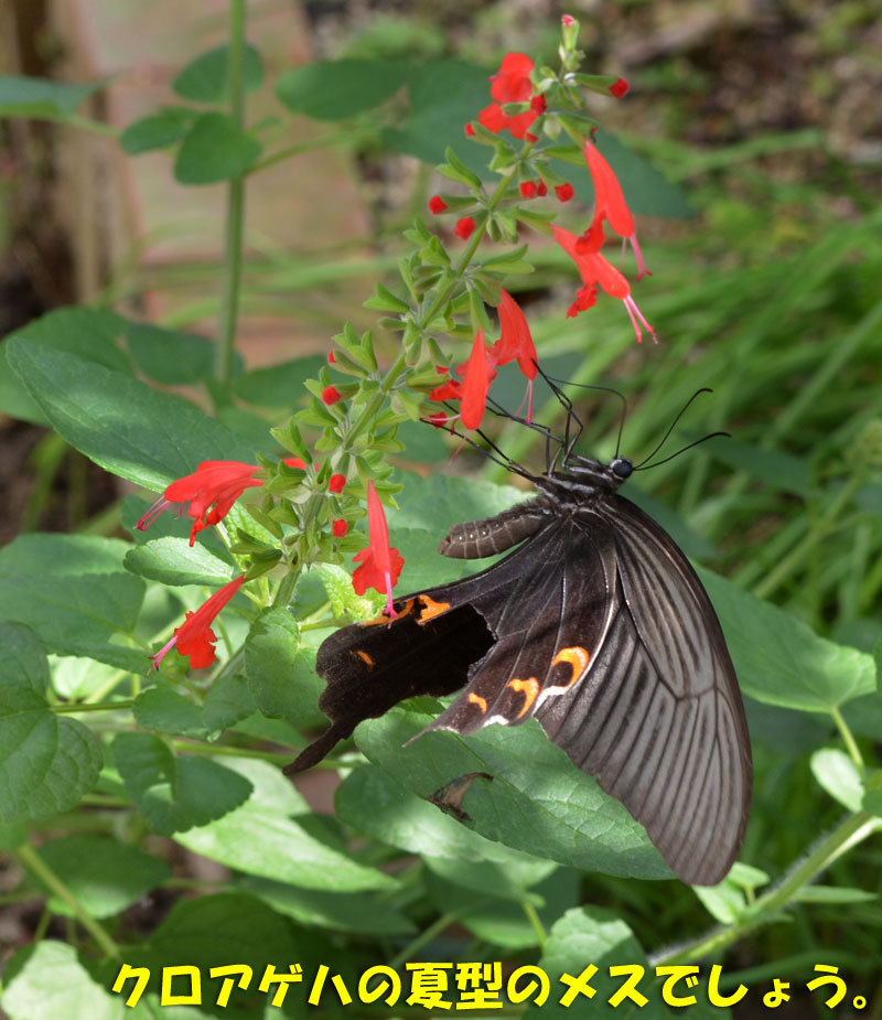 片側の後ろ翅がちぎれていますが、模様と尾から、クロアゲハの夏型のメスではないかと判断しました。