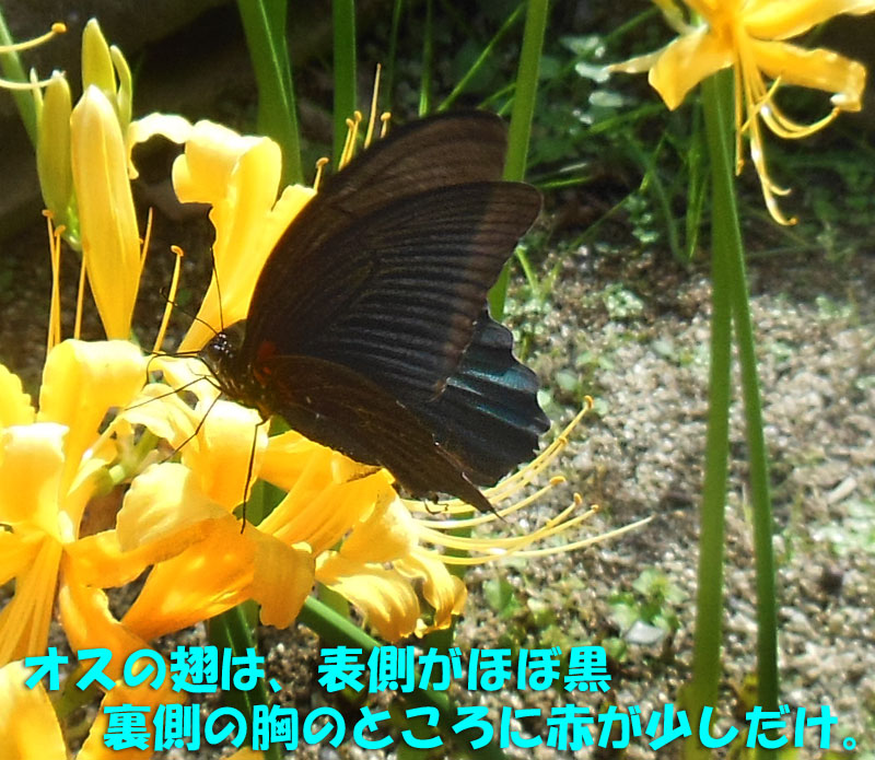 オスは飛んでいる時は、ほとんど真っ黒。たまに、ぎらっと青い色が見えたりします。