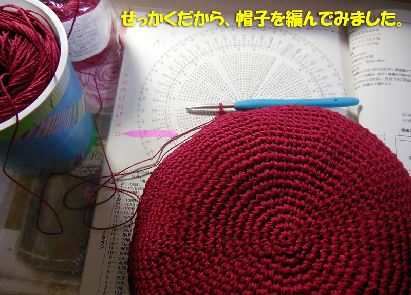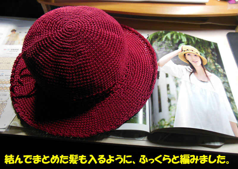 もともと頭は大きい方だし、夏用にしたいので、ゆったりサイズに編みました。髪を後ろにお団子にした状態でもかぶれます。