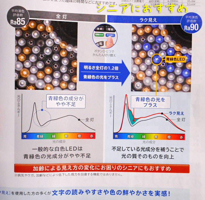 普通のLED電球に、青緑の光と赤色の光を少しプラスしてある「まなび」モードにすることができるのですよ。