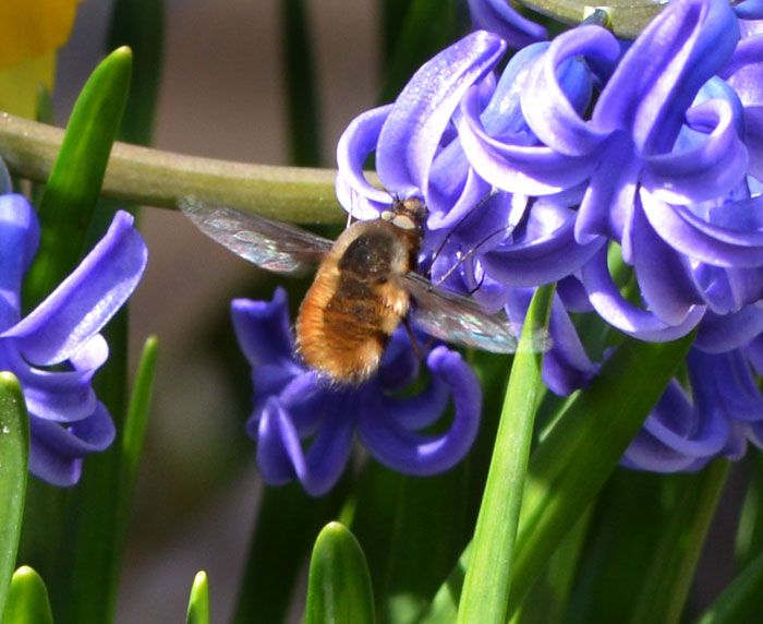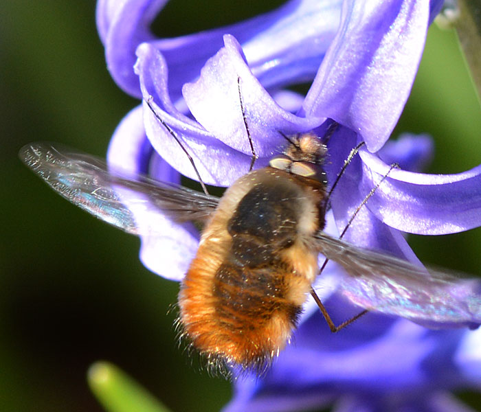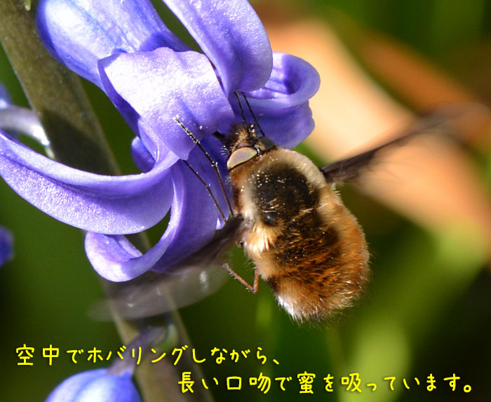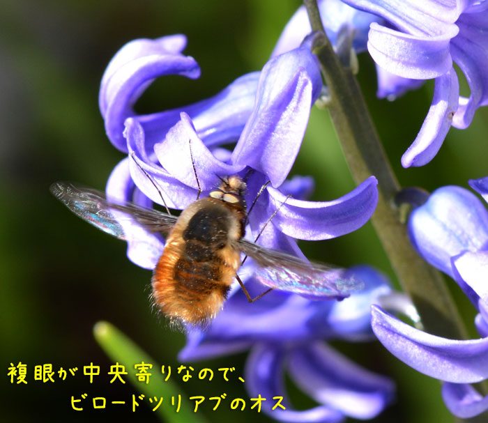 ビロードのように毛が密集して生えていて、上から釣られているみたいに止まって蜜を吸うから「 ビロードツリアブ