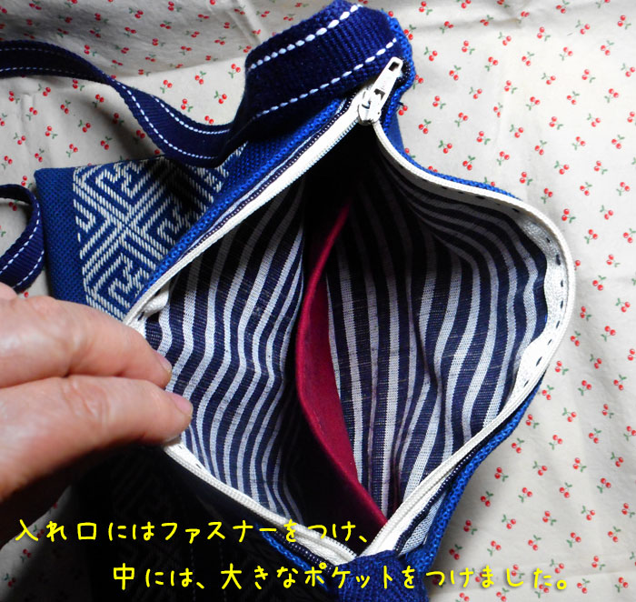 斜めに掛けるというので、その長さピッタリ(そのまま手を突っ込んで、バッグの底が触れる長さ)に合わせて作りましたよ。