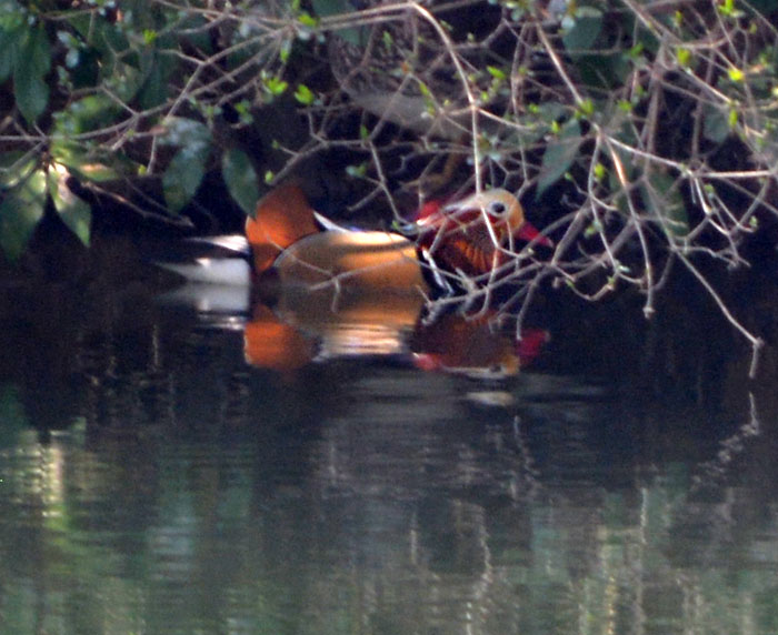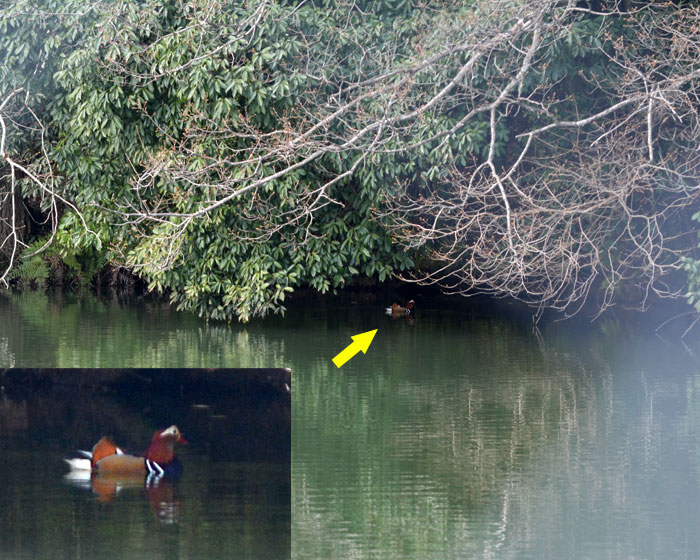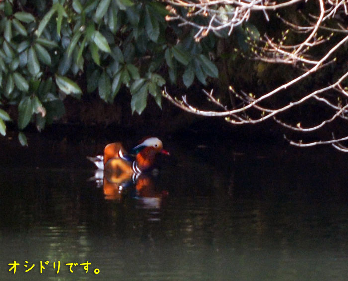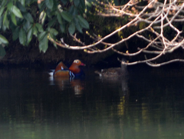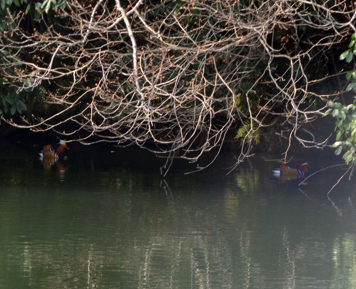 池の上に覆いかぶさった木々の下の暗がりに、オシドリが。