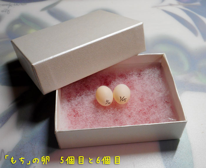 3個目と4個目は、もちが高い止まり木にとまったまま産み落としたので、そのままかごの底で割れていたし・・・
