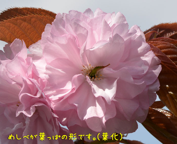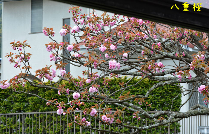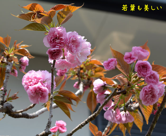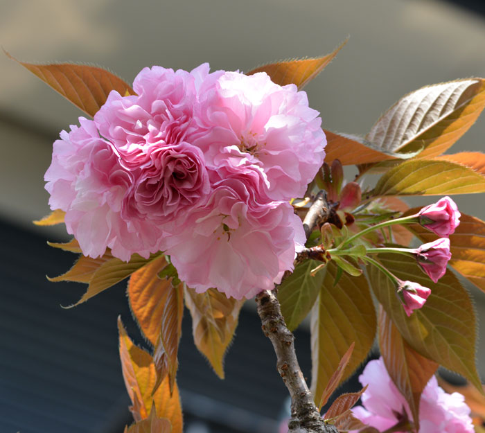 まずは八重桜。もうこのくらい咲きました。一分咲きか二分咲きくらいかな?